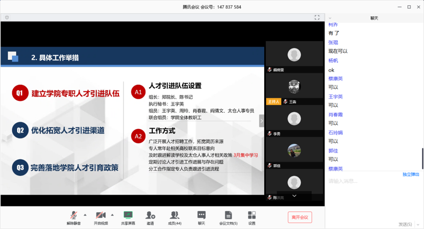 最后,陈洪亮书记进行了总结,开学第一周我院教育教学各项工作顺利开展,学生对线上授课情况满意度较高,陈书记肯定了全体教职工的辛勤付出,并建议大家总结线上授课经验,结合教学法积极探索怎样在线上授课中继续保持高质量的授课效果,为培养特色软件人才持续助力。