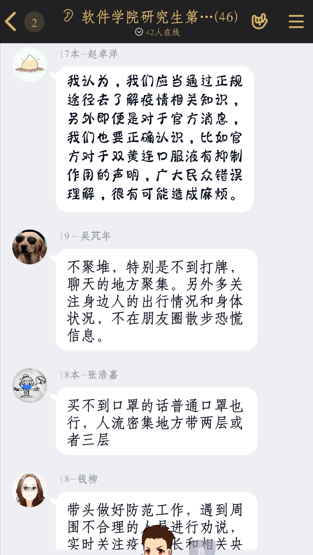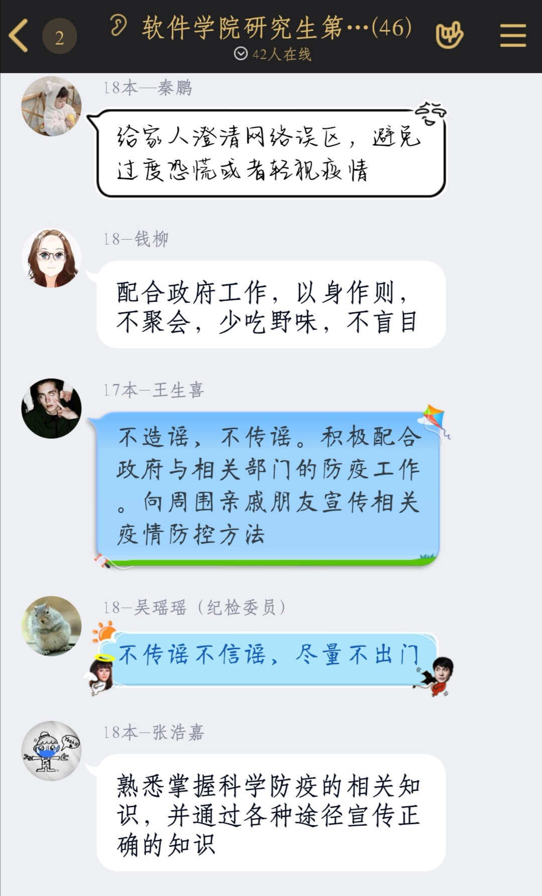 除此之外,支部党员结合自身实际,力所能及地为支援防疫贡献自己的力量。张重阳、王世浩、秦鹏等同志响应号召,参加居委会、村委会组织的相关防疫志愿者活动,他们戴上口罩,拿起工具,参与车辆排查、巡逻值班、义务宣传、清扫消毒、意见收集等工作,以实际行动展现了新时代学生党员的风采,为广大同学们树立了榜样。研究生党员梁奕桢同志,利用自己的专业优势,通过直播平台向低年级学分享自己的考研经验,义务讲解研究生报考相关事项和要点,赢得了低年级同学们的赞扬和感谢。