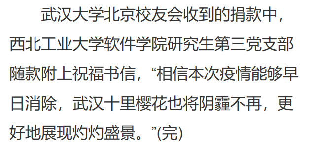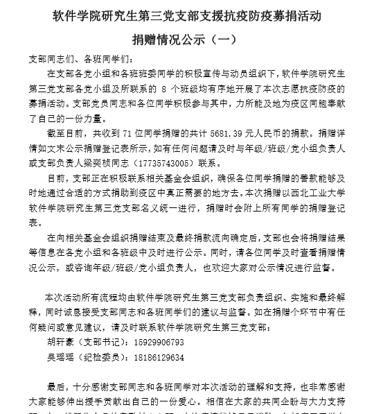 支部还发起了支援募捐活动。募捐活动主要面向本支部和党小组所联系的8个班级。在募捐活动发起后,各党小组及所联系的8个班级均有序地开展了募捐,最后共募捐所得5700余元人民币。通过与武汉大学北京校友会联系,商定委托该组织利用其校友等渠道购买防疫物资并运送到湖北疫区一线,yl9193永利集团研究生第三党支部将同学们的爱心送到前线真正需要的医护人员手中去。整个过程中,支部将募捐及捐赠情况进行两次及时公示,确保募捐活动各流程透明公开。最后,武汉大学北京校友会向支部同学们表达了感谢,相关内容也被中国新闻网、武汉大学北京校友会等媒体网站上进行报道。