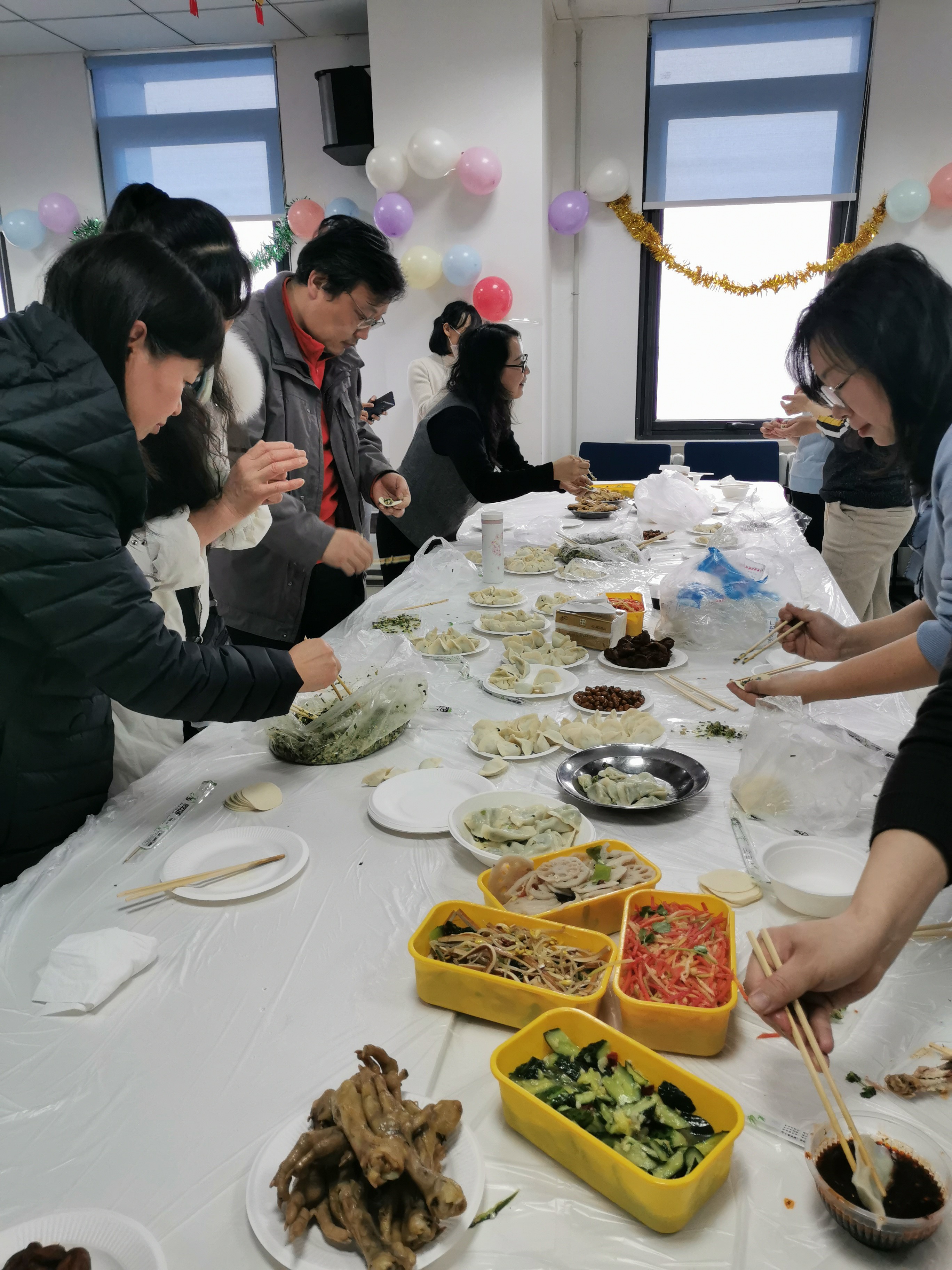 表彰会之后,职工迎新春联欢会正式开始。联欢会第一项流程为包饺子。活动在饺子洋溢出的香气中进行得如火如荼,老师们专注的投身于活动之中。当热腾腾的饺子端上桌,一整年的工作压力仿佛也随着饺子蒸汽的散去而烟消云散。