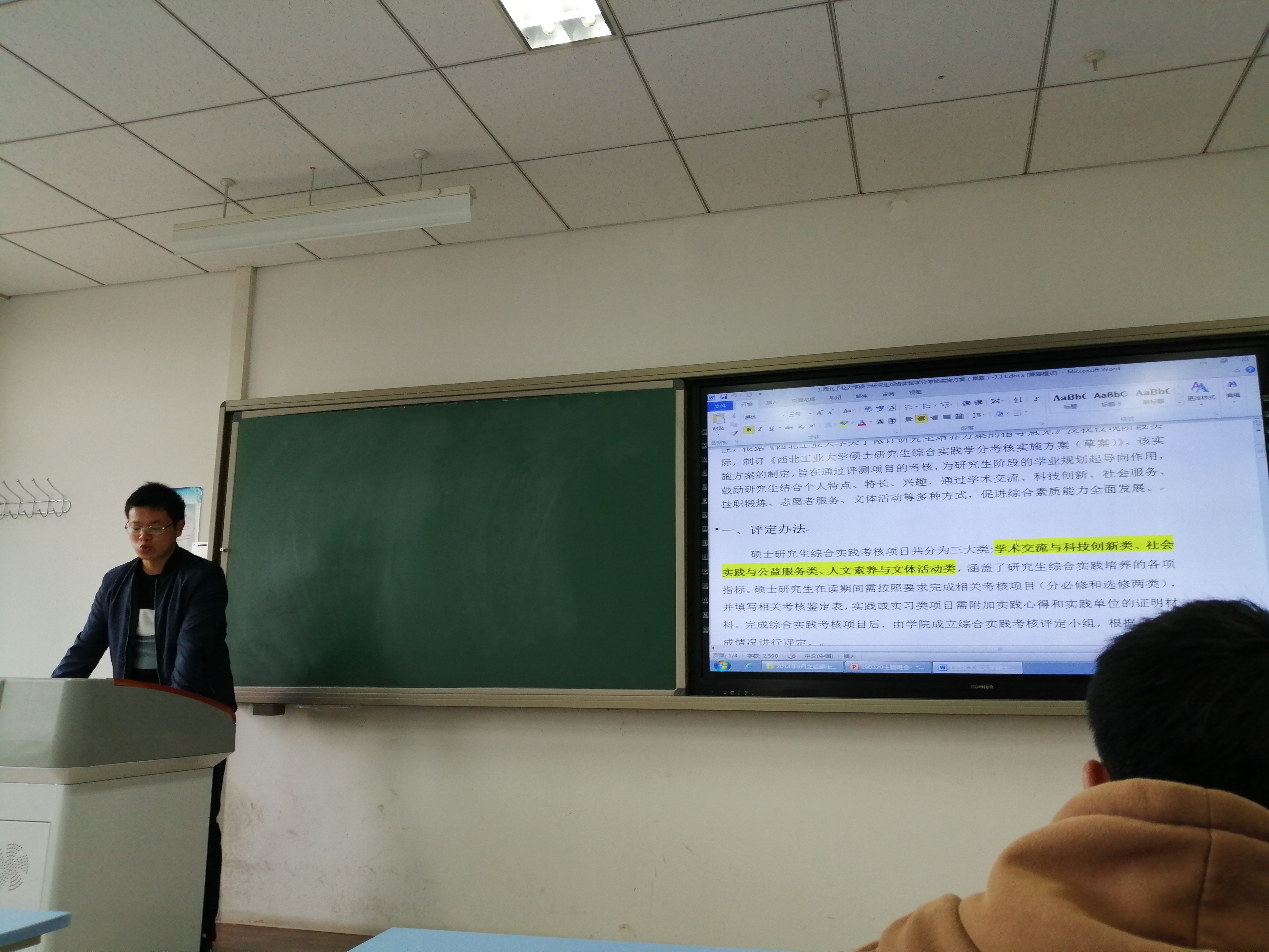 班会开始,班长胡轩豪同学先对上学期期末发的《永利集团硕士研究生综合实践学分考核实施方案》文件进行解读。《实施方案》主要包括学术交流与科技创新、社会实践与公益服务、人文素养与文体活动等三大类。通过对《实施方案》的解读,促使了大家对自己学业提前进行规划,同时这也有助于大家综合素质能力的全面发展。