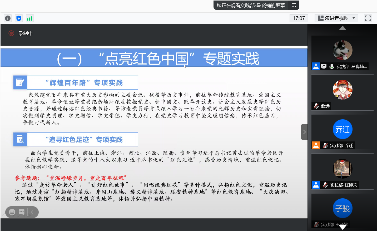 动员会主要分为“实践主题”、“实践内容”、“实践形式”、“工作安排”四个方面,最后安排了答疑环节。关于“实践主题”,实践部马晓楠首先为大家讲解了本次实践的指导思想,介绍分析了实践活动的主题,强调实践应切合“永远跟党走——百年初心路·壮阔新征程”的实践主题,使同学们了解社会实践的深远意义。