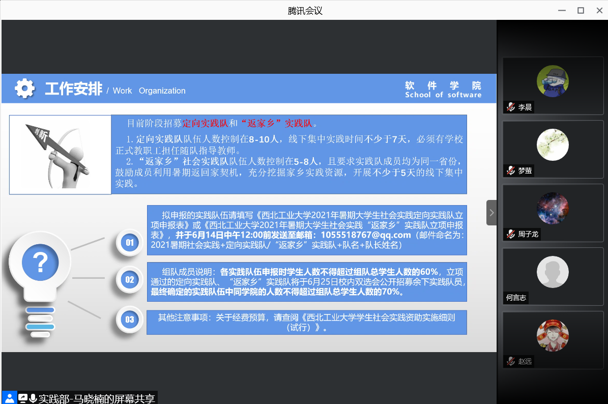 本次动员会的另一个重点部分则是“工作安排”模块。结合申报立项时间轴,对定向实践队和“返家乡”实践队的人员构成和实践规模等进行了进一步讲解,除此之外,列举了一些注意事项,督促同学们关注每一个重要的时间节点,以便顺利完成本次实践。