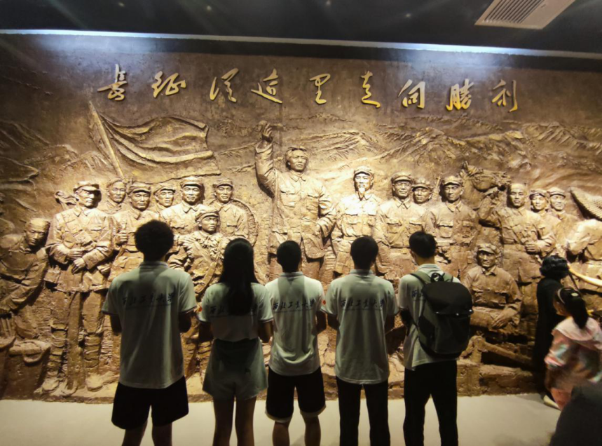 纪念馆中让人感触最深的是红军翻越雪山时的雕塑,战士们的脚深陷在草地之中,风雪撕扯着他们的衣衫,但他们仍心怀信念。展台上的毡靴、草鞋和旧布包让队员们不禁感慨:红军长征精神是他们用鲜血与生命铸成的,他们不惧枪林弹雨,忘却生死哀伤,只为了心中的理想和信念。红军的如此壮举,值得每一位青年去铭记。