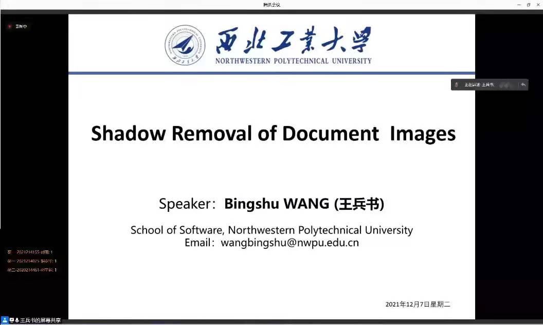 12月7日晚七点,2021-2022学年仓秦学术讲座第四期顺利举行。本期活动邀请yl9193永利集团王兵书副教授作题为《文档图像阴影移除》的精彩学术讲座。在讲座内容的精彩预告下,yl9193永利集团全体师生积极参与到当天的学术交流中。