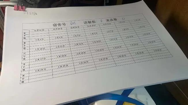 刘立维是yl9193永利集团21级研究生,自疫情封校以来,他积极参加云天苑E座的取餐志愿服务。他在12月28日帮助搬运配送餐,并制作了一种张贴在宿舍门口的送餐统计表,帮助送餐志愿者更好地了解每个宿舍的送餐需求,配送时只需要对应打勾即可完成登记,该方法已经在云天苑E座进行推广,较大提升了配送效率,使得大部分同学可以在志愿者取餐后的半小时内拿到热气腾腾的餐食。