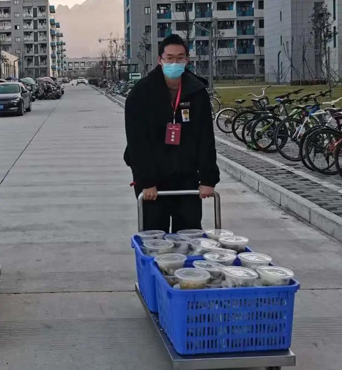 在12月29日,刘立维负责带领志愿者去云天苑餐厅二楼取餐,与餐厅负责人对接,及时在志愿者群中汇报装车及发车情况,并与其他志愿者一起将E座1329份餐食快速有序地送到宿舍,保障后续志愿者能够快速将餐食分发到各楼层。