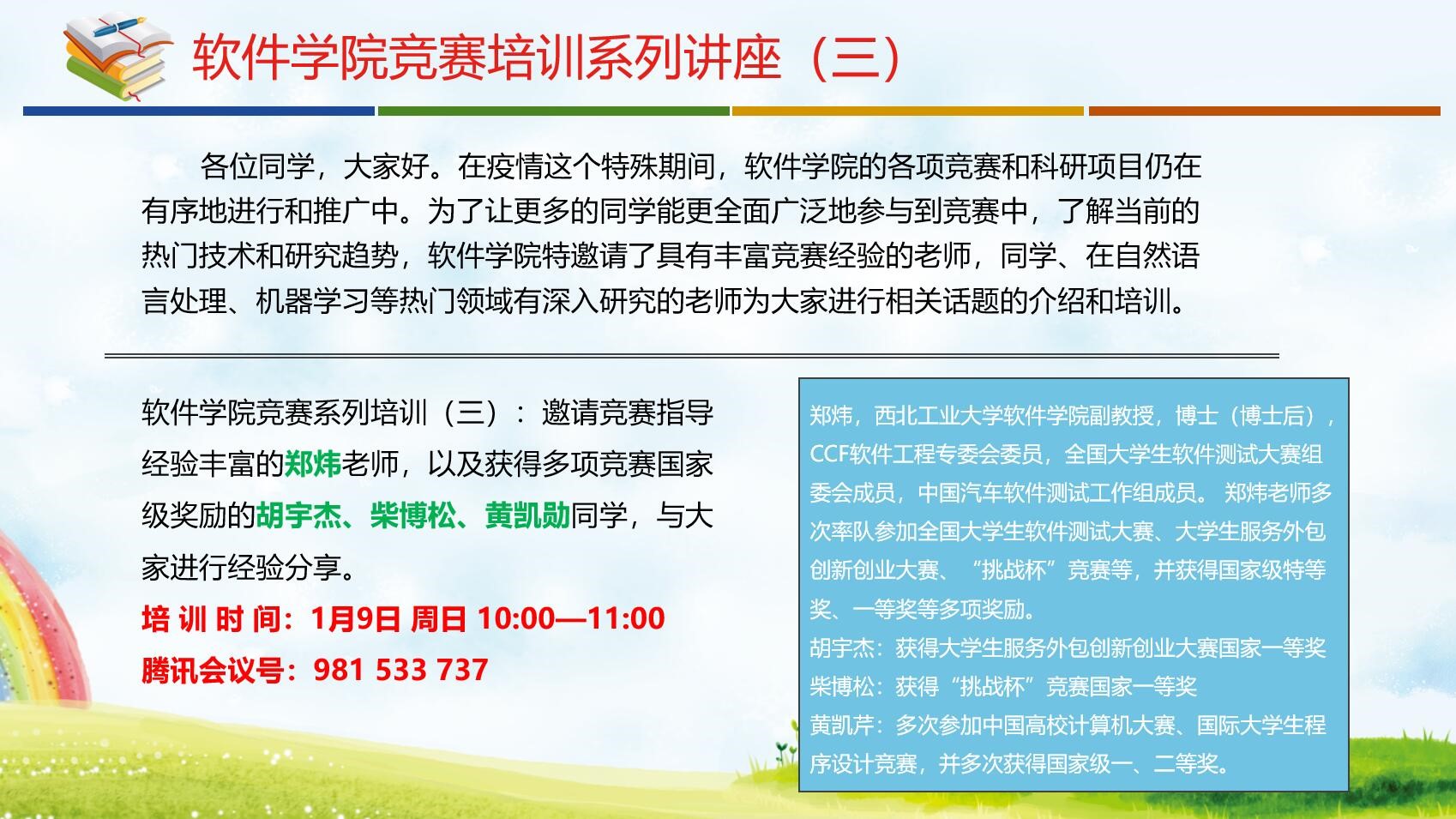 yl9193永利集团竞赛系列培训(三)∶1月9日周日10:00—11:00学院邀请竞赛指导经验丰富的郑炜老师,以及获得多项竞赛国家级奖励的胡宇杰、柴博松、黄凯勋同学,与大家进行经验分享。