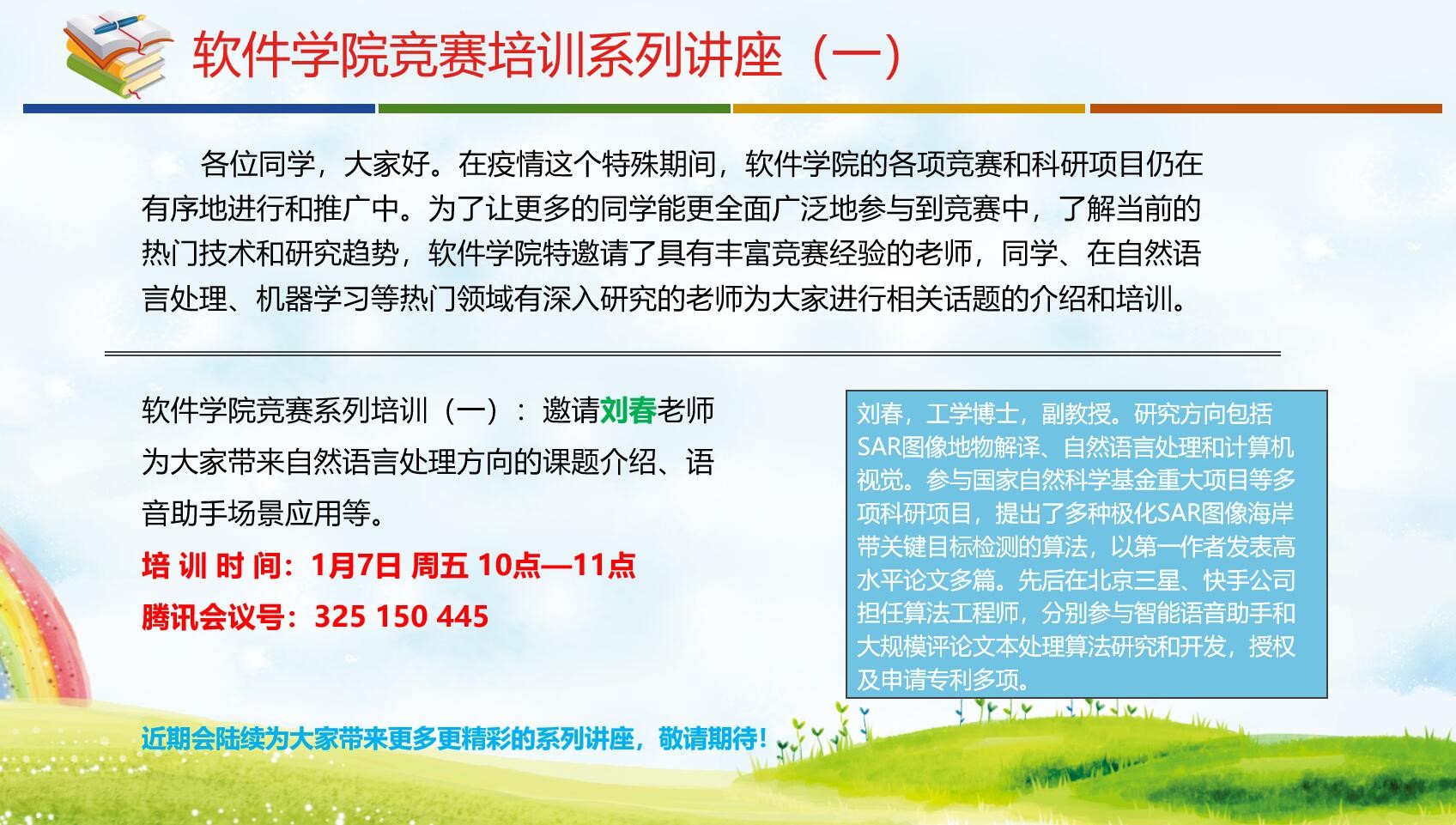 yl9193永利集团竞赛系列培训(一)︰1月7日周五10点—11点,学院邀请刘春老师为大家带来自然语言处理方向的课题介绍、语音助手场景应用等。