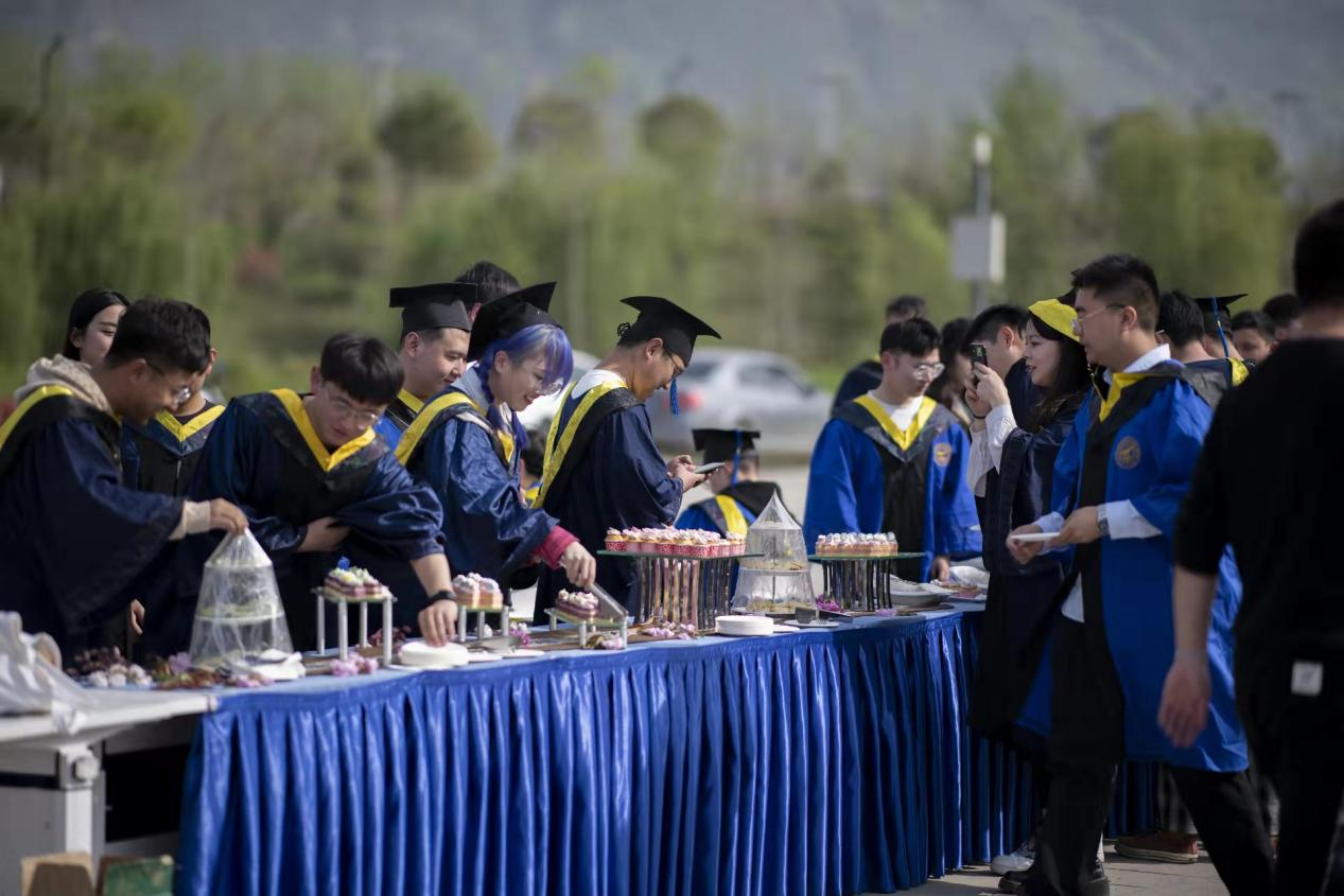 此外,在典礼的暖场环节中,学院还为毕业生准备了些许茶点,这一份惊喜象征着学院对毕业生们“暖心”的祝福,同学们身着学位服三五成群,在典礼现场合影留念,同学们彼此畅谈、彼此祝福、交换礼物。