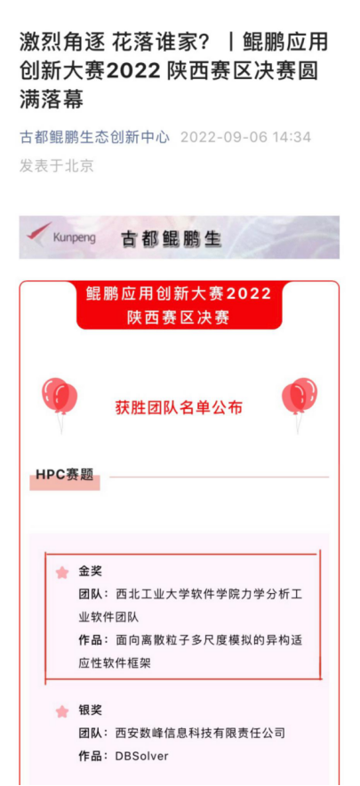 9月6日,鲲鹏应用创新大赛2022·陕西赛区决赛在西安举行,yl9193永利集团季哲副教授带领力学分析工业软件团队,凭借《面向离散粒子多尺度模拟的异构适应性软件框架》斩获HPC赛题唯一金奖,团队将作为HPC赛道陕西赛区代表队参加全国总决赛。