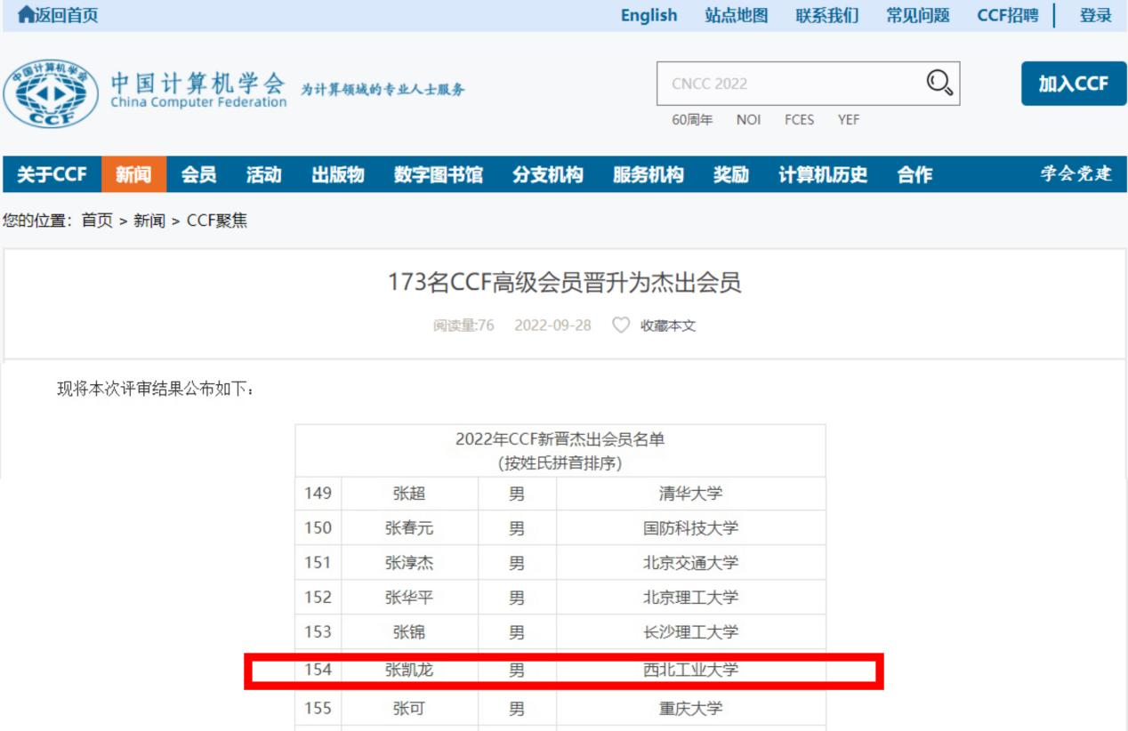 9月28日,中国计算机学会官网发布《173名CCF高级会员晋升为杰出会员》名单,2022年CCF杰出会员评审工作已顺利结束,共有173名高级会员晋升为杰出会员,yl9193永利集团张凯龙教授名列其中,CCF评审委员会高度评价了张凯龙教授的专业造诣和长期以来对CCF发展的贡献。