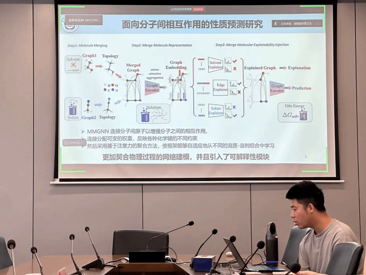 杜文杰的报告围绕“结构决定性质”这一核心理念,系统介绍他及团队近年来在分子交互建模方面的研究进展。分子间相互作用的建模在药物发现、材料设计等领域具有重要意义。然而,由于分子结构的复杂性、多样性以及作用机制的动态性,如何实现可解释、泛化性强的交互预测模型,仍面临诸多挑战。基于上述挑战他首先设计一种可解释的图融合模型用于准确预测分子之间的吉布斯自由能,强调结构信息的物理一致性与表达能力。其次他提出迭代子结构提取框架,基于信息瓶颈理论,从相互作用的分子对中挖掘关键子结构,实现动态且互动式的子结构识别。进一步地,他构建了基于不变性信息瓶颈的模型,用于药物-药物相互作用(DDI)预测,在应对结构分布偏移和提升型稳健性方面表现优越。最后,还探讨了预训练大模型在分子交互预测中的迁移潜力,揭示其对复杂结构语义的建模能力。