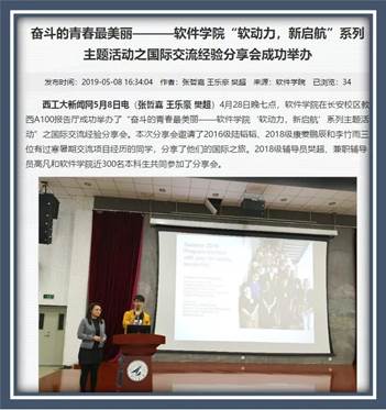 学院牵头的“单车随手扶,城市更温暖”活动还得到西安日报、陕西新闻联播、陕西传媒网、中国青年网、中国文明网的联合报道,受到了社会的广泛好评;学院硬核“女神”白雨桐先进事迹被中国青年报、搜狐网、青塔网、西安日报、校园教育刊登文章,进行专题报道;学院与新华社合作进行国宝解密与H5动态设计制作,在国宝中寻找丝路文化密码,“国宝故事”唐三彩骆驼载乐俑以及唐镶金兽首玛瑙杯在新华社宣传报道,浏览量高达100W+。