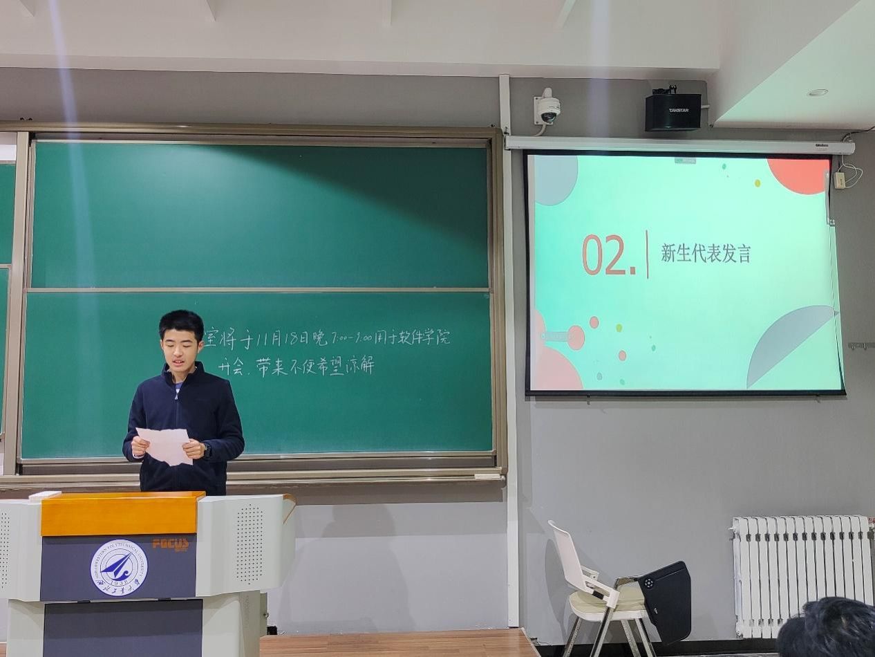 随后,大一新生代表冯波翰同学进行发言,他讲述了自己来到yl9193永利集团学生会的缘由,他谈到,我们加入了学生会、团学组织这个大家庭,是希望发现自己的不足之处,并及时改正,戒骄戒躁,一起创造出学生会新的沸点,将“公诚勇毅”刻入骨里,“三实一新”记在心头!