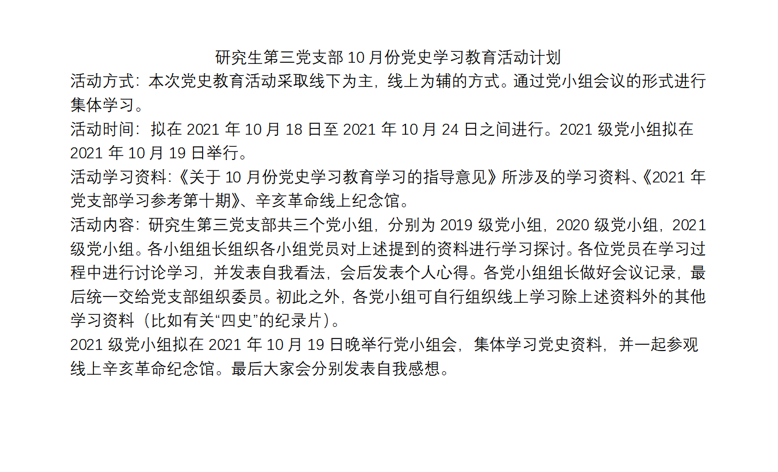支部严格规范“三会一课”制度,时刻关注国家、学校、学院动态,定期召开党员大会、支部委员会、党小组会,开展主题党课,提高基层支部的凝聚力和战斗力,发挥好战斗堡垒作用。在“三会一课”基本形式之上,创新方法,深入开展“党史学习教育”主题教育,并突出政治学习和思想教育,加强党性修养。支部成立的两年多时间里,共召开支部党员大会19次,支委会28次,党小组会29次,开展组织生活会3次,专题学习6次,支部委员讲党课14次,开展服务实践活动3项,思想政治教育活动及“主题党日”活动 6次。