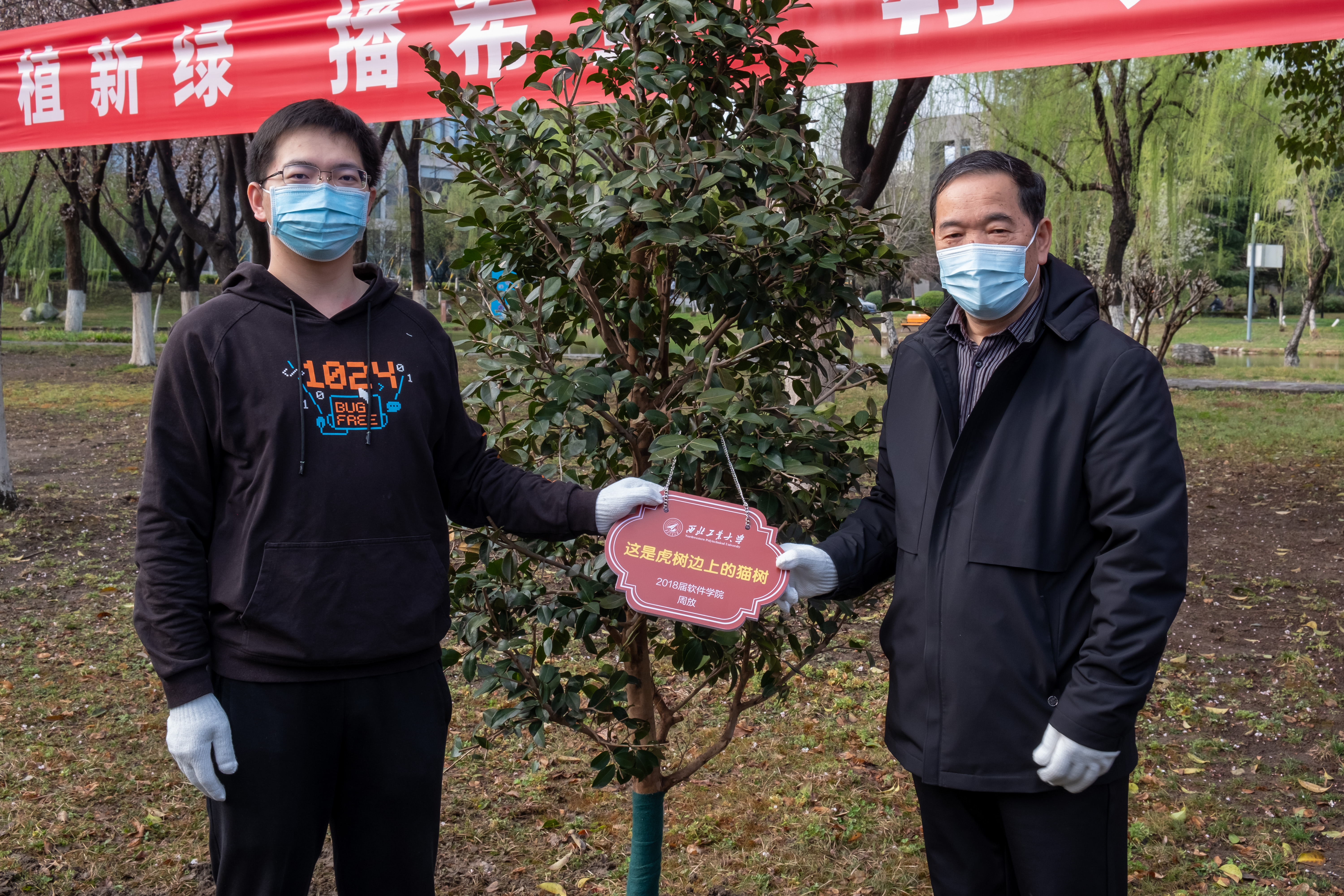 随着植树活动结束,现场举行了绿植认养挂牌仪式,yl9193永利集团2022届本科毕业生周放作为校友会“绿叶对根的情谊”项目认养人代表与陈建有副书记等人一起对校友树进行现场挂牌认养。