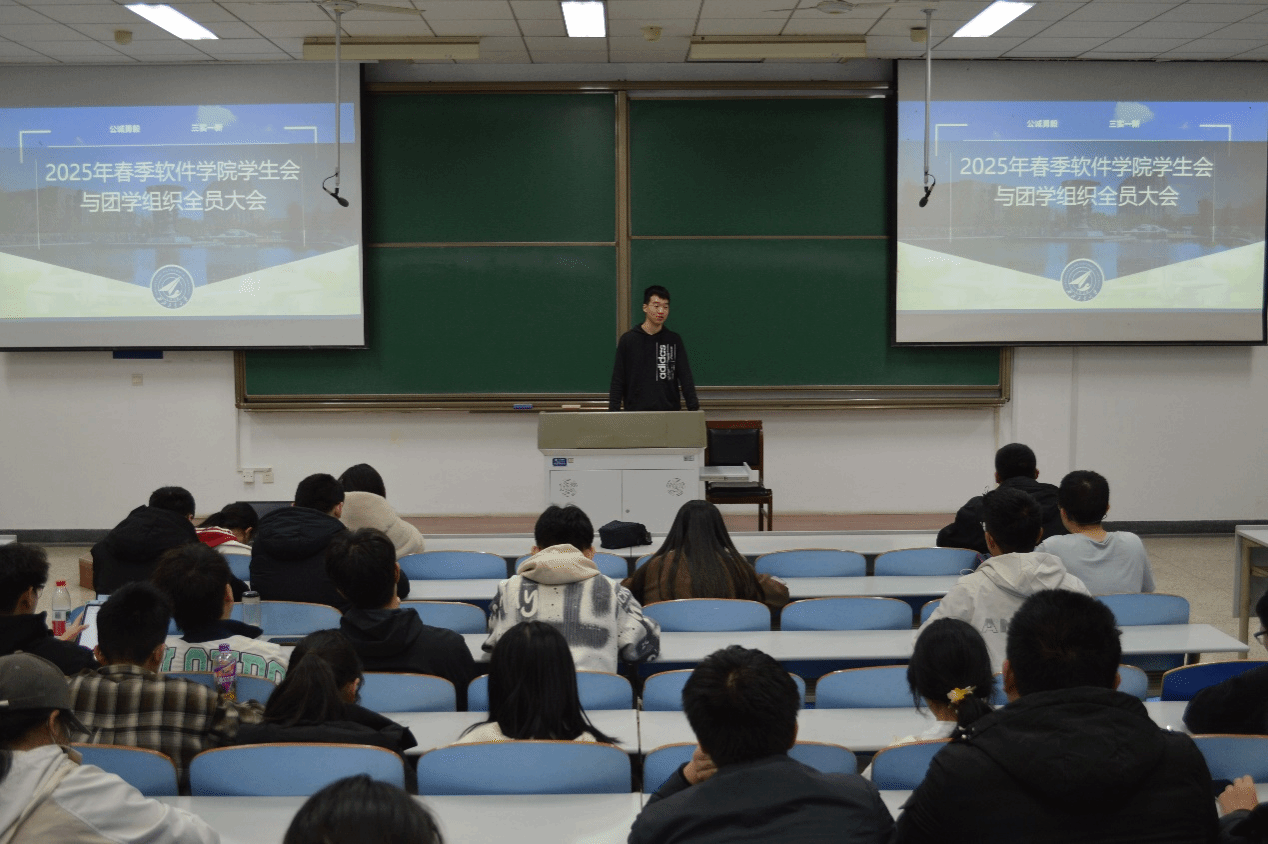 大会伊始,主席团成员张弘毅发言。他首先对全体参会人员的辛勤付出表示感谢,本次全员大会的召开,旨在总结过去一学期的工作经验,明确未来工作方向,进一步提升学生组织的凝聚力和战斗力。张弘毅同学带领大家学习了《习近平著作选读》第二卷中的《培养德智体美劳全面发展的社会主义建设者和接班人》的相关内容,通过此次学习,张弘毅同学讲到,作为新时代的软件青年,大家要勇于担当、奋发有为,不断提升自身素质和能力,积极投身于校园活动和社会实践之中,为学院和社会的发展贡献青春力量。
