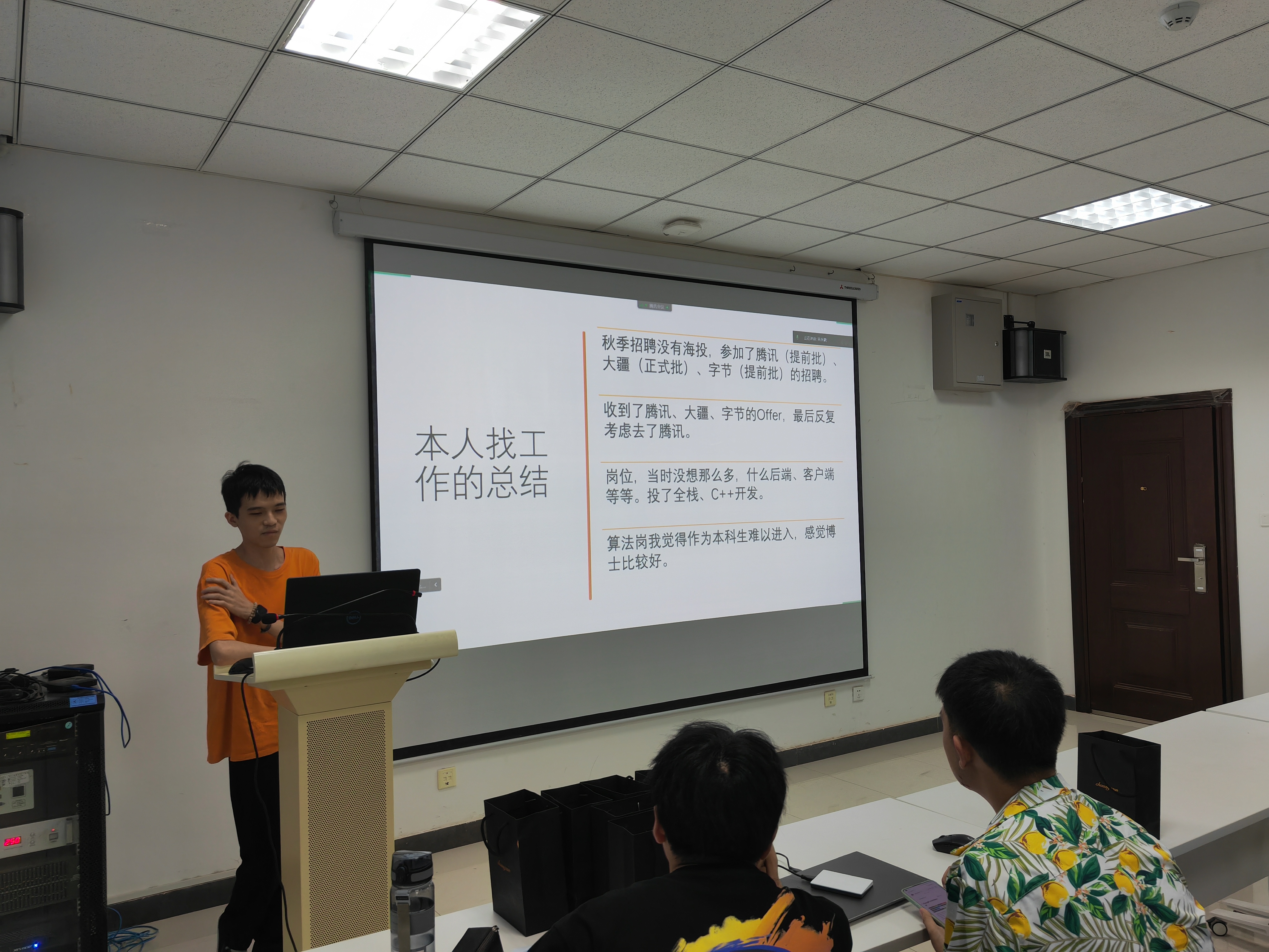 就业毕业生代表胡宇则从就业信息获取、就业政策、面试技巧、工作感悟等方面为同学们答疑解惑,传经送宝。