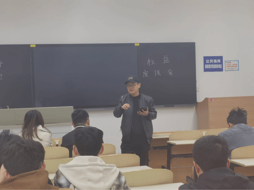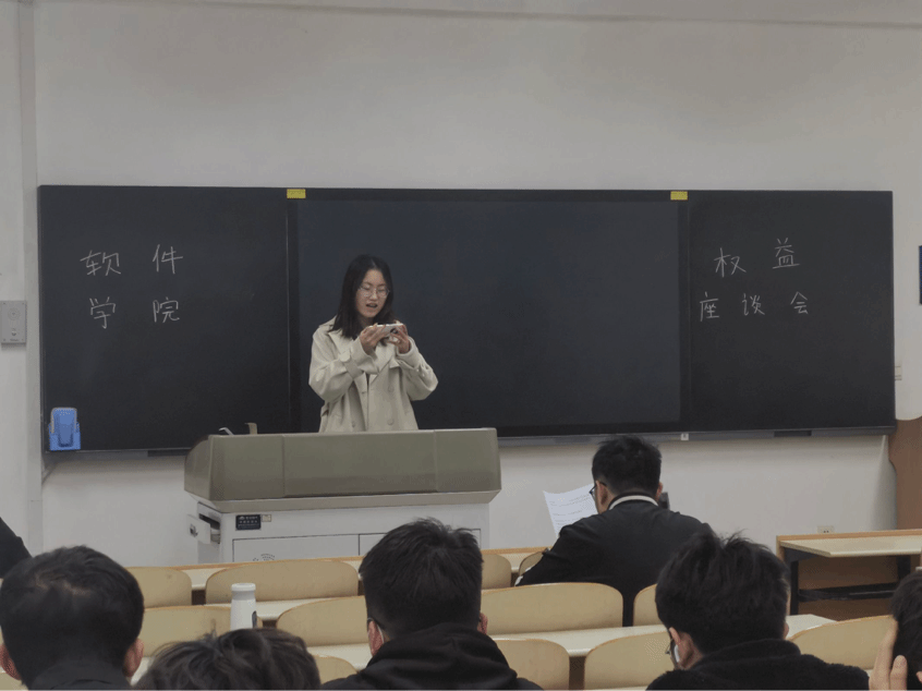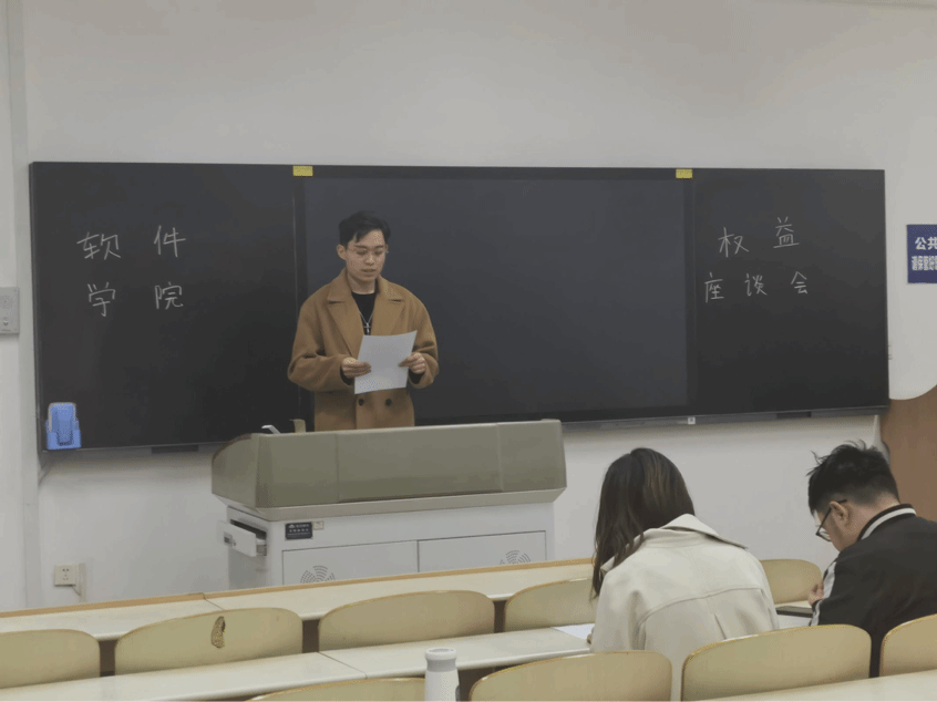会议伊始,杨鹏瑞简要的介绍了本次权益座谈会的主题及目的,希望同学们畅所欲言,积极反映同学们在学习生活中所遇到的权益问题。