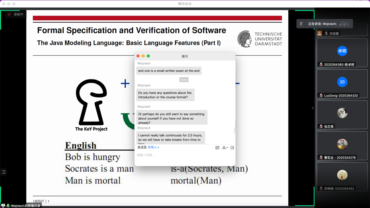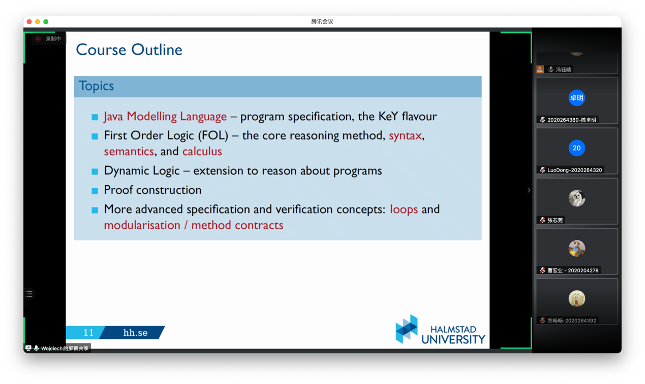 2021年4月28日晚19:00,yl9193永利集团全英文课程“程序逻辑与程序形式化验证”(Formal Verification of Imperative Programs with Program Logics and Interactive Theorem Proving)在线上顺利开讲。该课程由瑞典哈姆斯塔德大学(Halmstad University)副教授Wojciech Mostowski主讲。