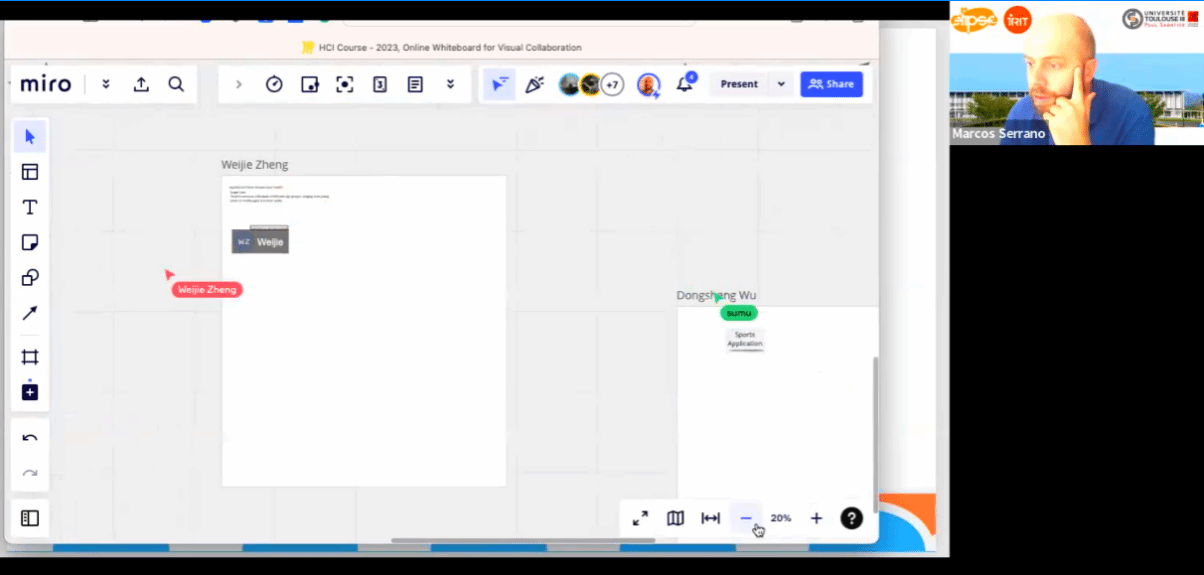 本次课程是Marcos教授首次面向永利集团的学生授课。在正式开课之前,Marcos教授先向同学们做了自我介绍,然后以学术汇报的形式向大家简要介绍了他最近的科研成果。教授全程通过miro平台与学生们进行互动,了解了同学们的专业方向以及对人机交互的认识,以此作为本次人机交互课程的引入。