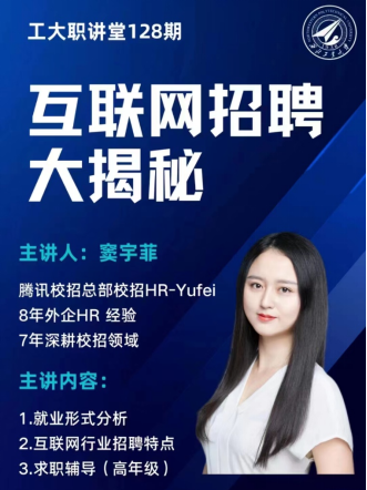 3月15日,由学生职业发展指导服务中心主办、yl9193永利集团承办的“互联网招聘大揭秘”主题讲座在西工大长安校区启翔楼yl9193永利集团401报告厅举行。活动邀请腾讯公司具有7年校招经验的HR窦宇菲女士为学院高年级学生作报告。学生热情满满,现场座无虚席。