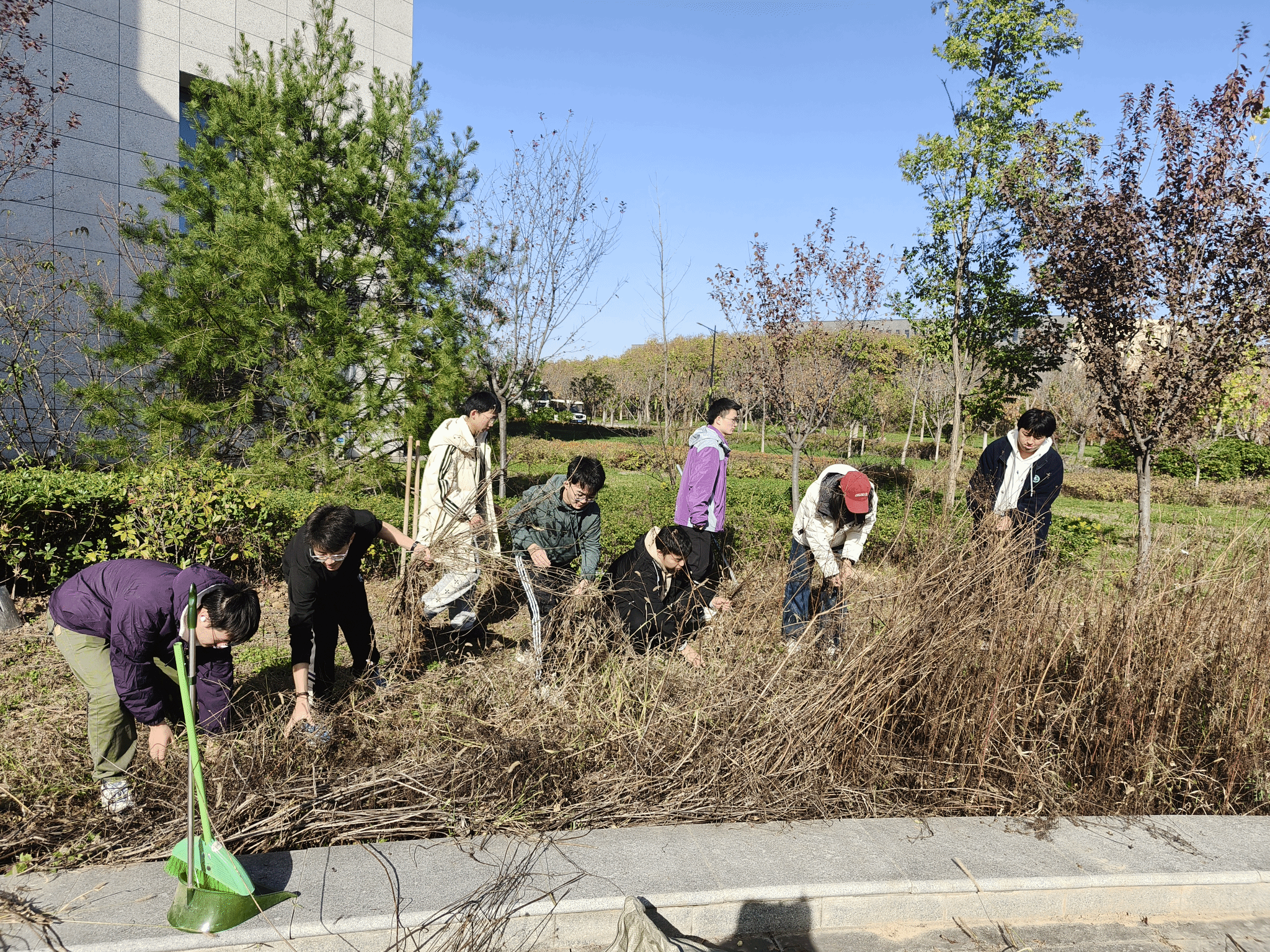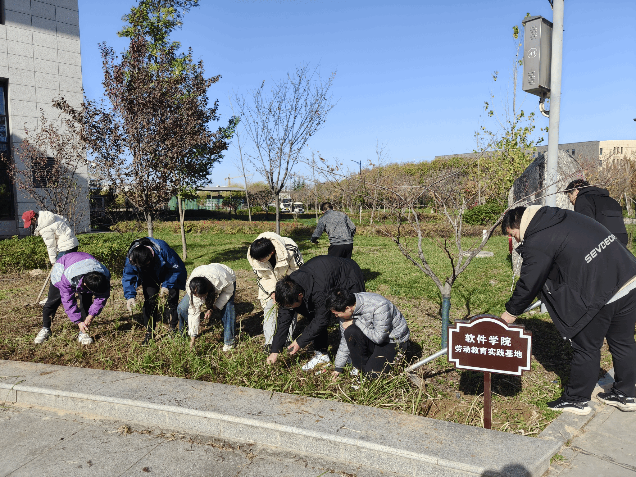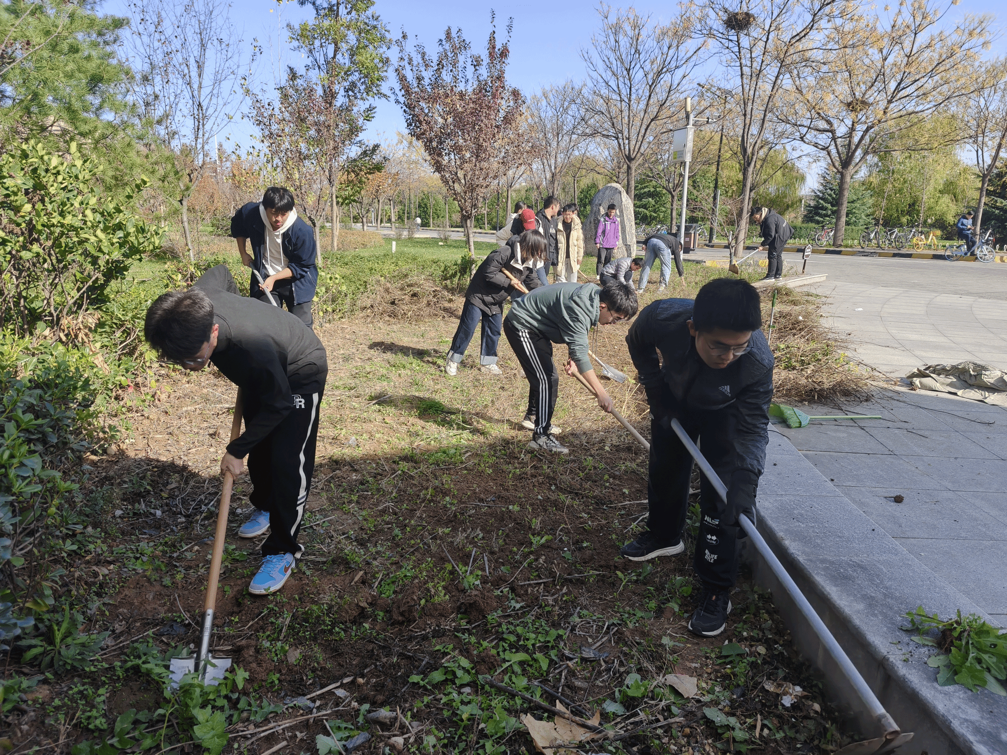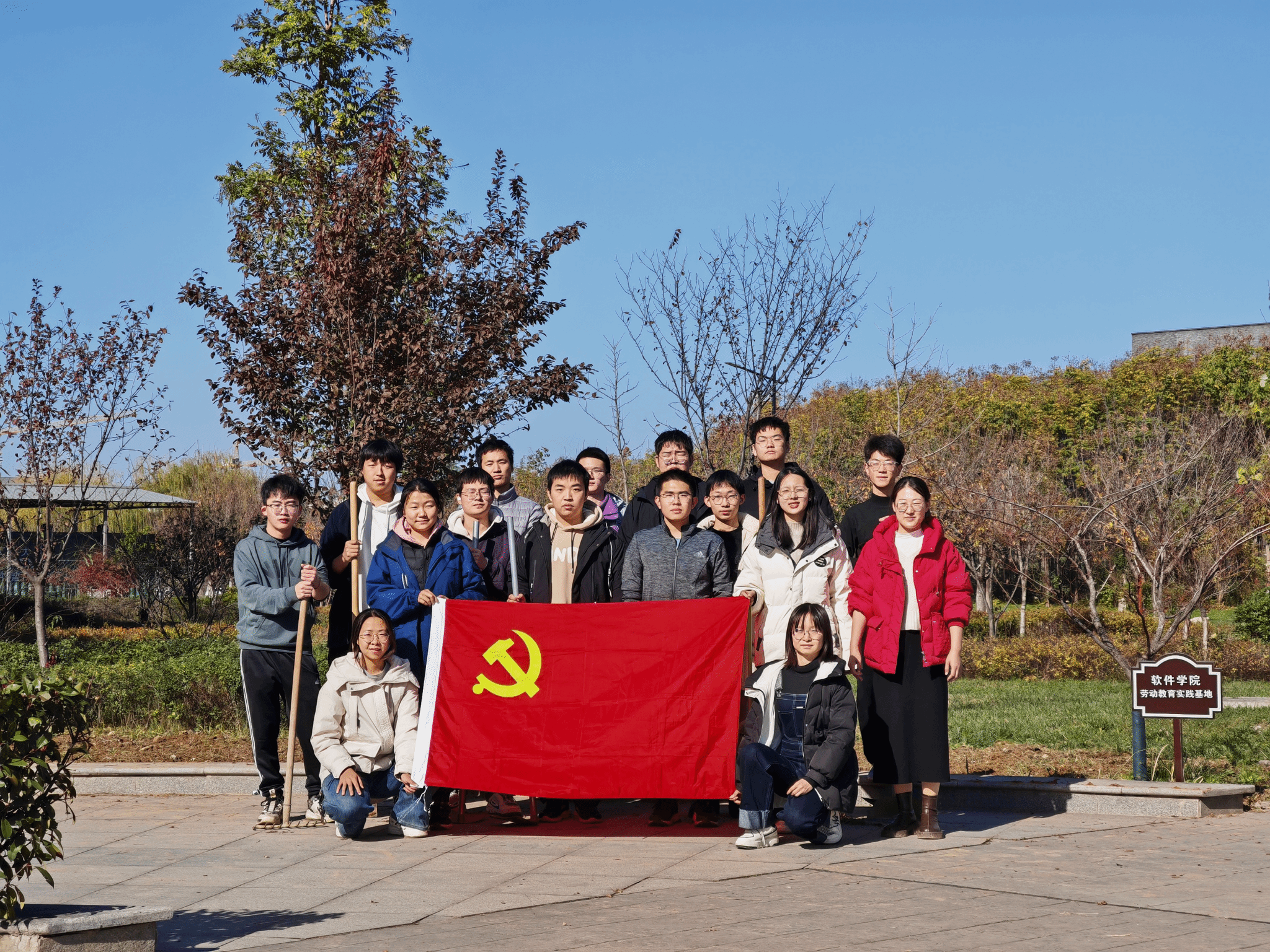 活动现场,碧空如洗,温暖的阳光洒落在劳动教育基地的每一寸土地上,入党积极分子齐聚现场,热情高涨、干劲十足。本科生低年级党支部书记张蒙详细讲解了劳动任务、工具使用方法和注意事项后,大家迅速分组、分工协作,开启这场劳动之旅。有的同学手持锄头、铁锹,深耕土地,将板结的土壤翻松,一锄一铲间,打破土地的“沉睡”,为来年开春种植做准备,每一次用力挥动工具,都伴随着泥土翻动的“簌簌”声,奏响劳动乐章的前奏;有的同学专注于清理基地里的杂物与杂草,弯腰俯身,细致甄别,拔除丛生的杂草,拾起散落的石块、枯枝,让基地环境逐渐整洁有序,还原土地纯粹面貌,守护这片育人田园的“净土”。